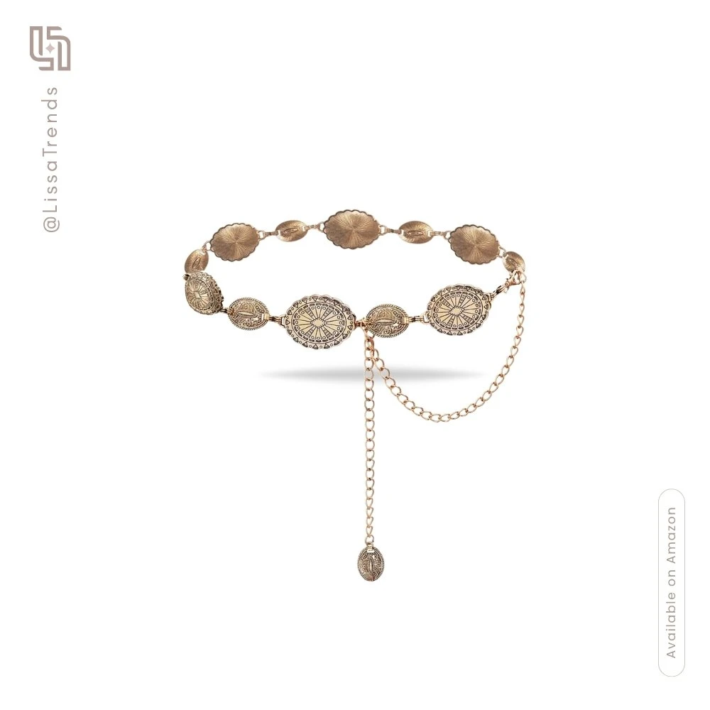 Embrace free-spirited elegance with this Western Concho Chain Belt in warm Champagne Gold. Featuring ornate metal conchos, lobster clasp closure, and 4-step electroplating. Perfect for country concerts, boho styling, or when artisanal western charm meets refined craftsmanship.