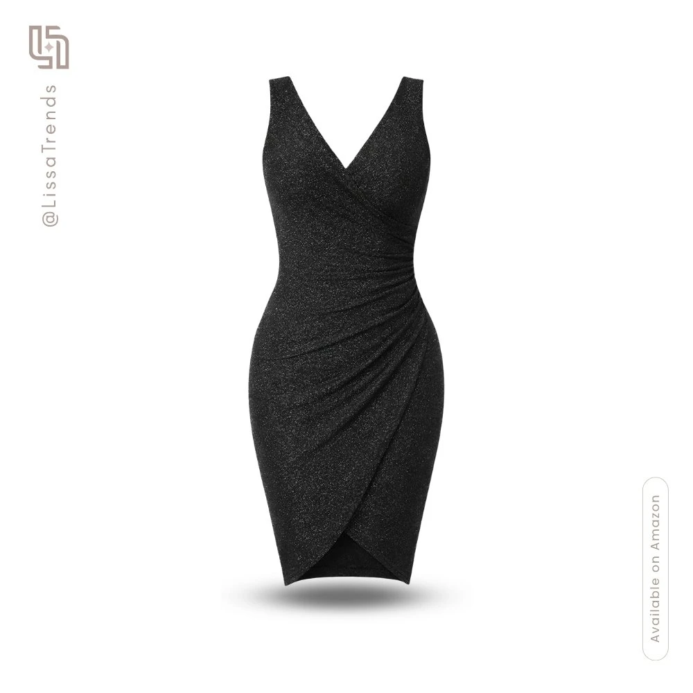 This sequin black ruched wrap dress brings refined glamour to your special occasion wardrobe. Designed for the woman who values both style and sustainability, it features a flattering silhouette that hides while it highlights — perfect for celebrations, parties, or any moment that calls for elevated confidence.