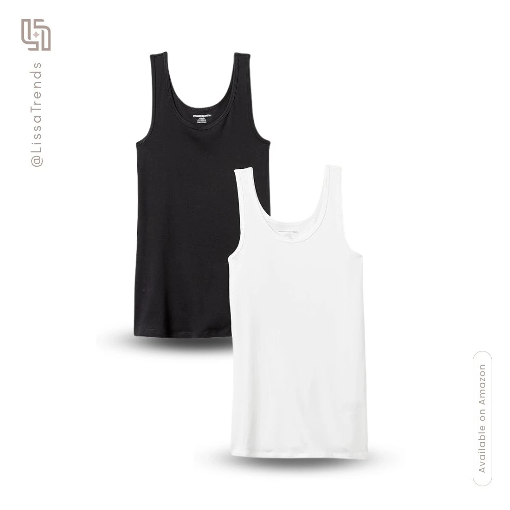 Complete your layering essentials with this Essential Cotton Modal Tank Top 2-Pack in timeless Black and White. Featuring a flattering scoop neck, slim-fit silhouette, and ultra-soft micro rib fabric. Perfect under cardigans or worn solo for warm-weather ease.