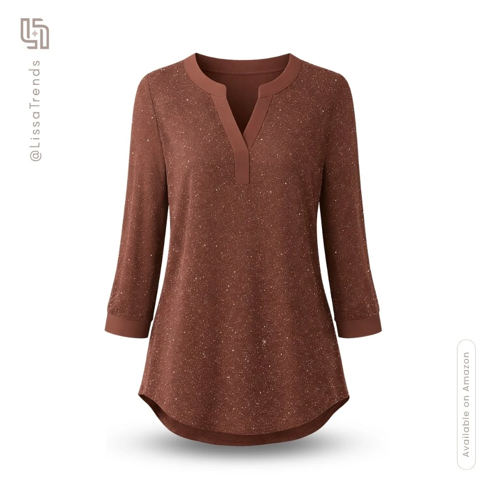 Add sophisticated shimmer to any occasion with this Double-Layer Mesh Blouse in rich Chocolate Brown. Featuring elegant 3/4 sleeves, V-neck design, and wrinkle-resistant fabric. Perfect for transitioning from office to evening events with effortless polish.