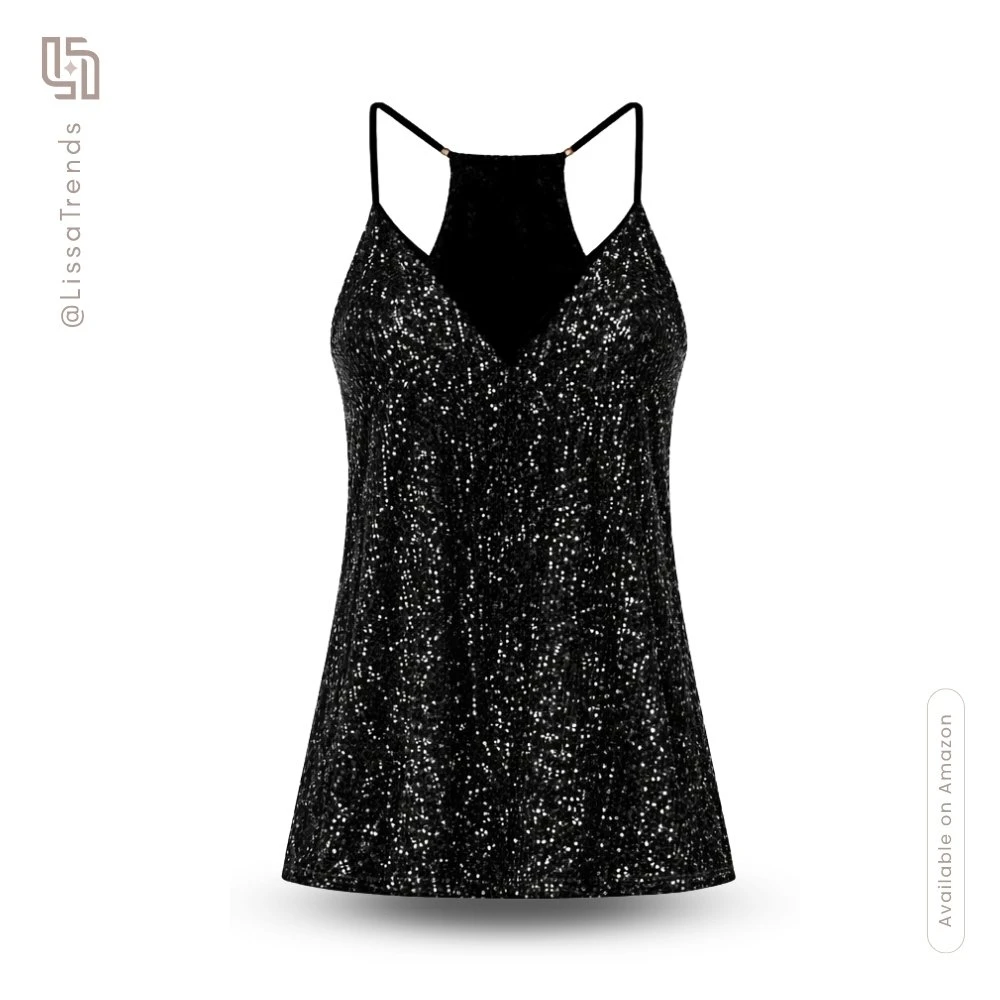 Elevate your evening wardrobe with this Sequin Strappy Camisole in timeless Black. Designed with a flattering V-neckline, racerback, and fully lined interior for comfort. An essential piece for sophisticated nights out, dinners, or when understated shine is the goal.